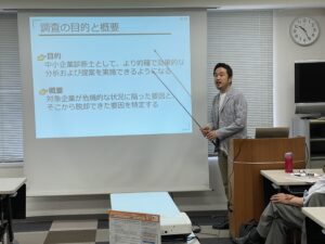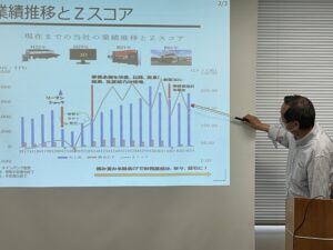 前半は、令和4年度調査・研究事業をもとに、ものづくり企業の経営状況が危機的状況か否かを判断する際に役立つ指標「新アルトマンZスコア」や、「ものづくり企業の肝は現場にある」と実証すべき調査研究結果を北川健介先生と大友隆史先生で講義していただきました。後半は、「有限会社田中製作所 代表取締役 門田悦子様」にご登壇いただき、「存続の危機」に遭遇し、そこからどのように脱却・成長したかを説明していただき、赤田啓介先生に詳細を解説していただきました。